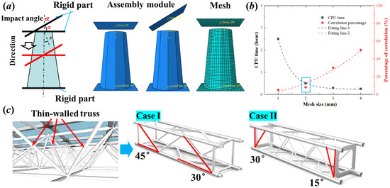 Procedure of finite element modeling: (a) Example of impact angle and boundary conditions of tapered nonagon tubes; (b) mesh convergence sensitivity analysis of thin-walled tube in terms of CPU time and percentage of correlation; (c) oblique impact angles from thin-walled truss in civil engineering.