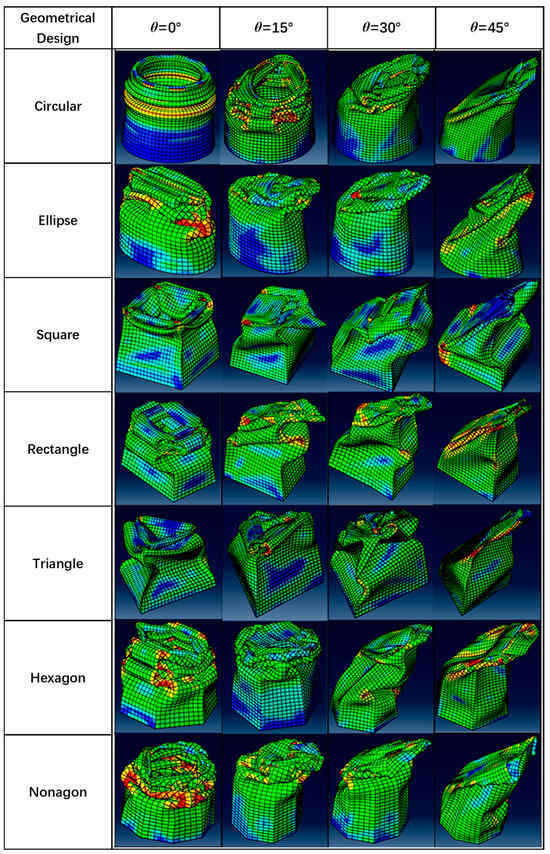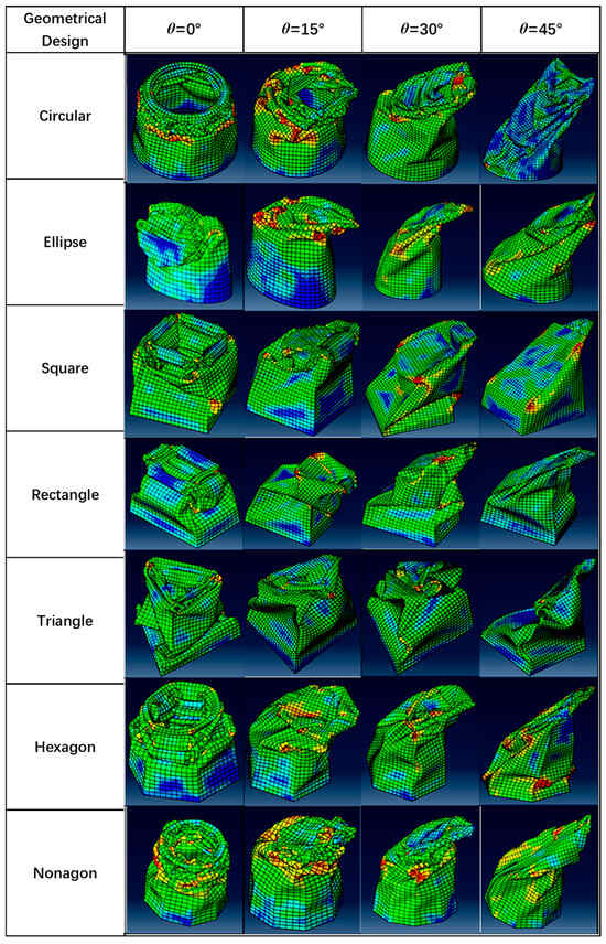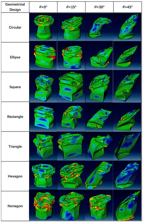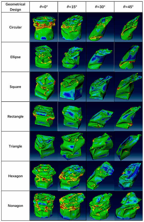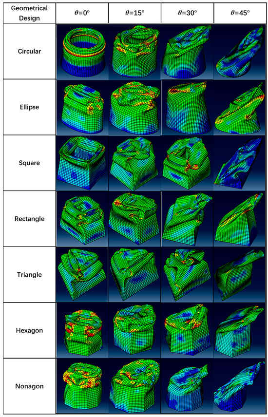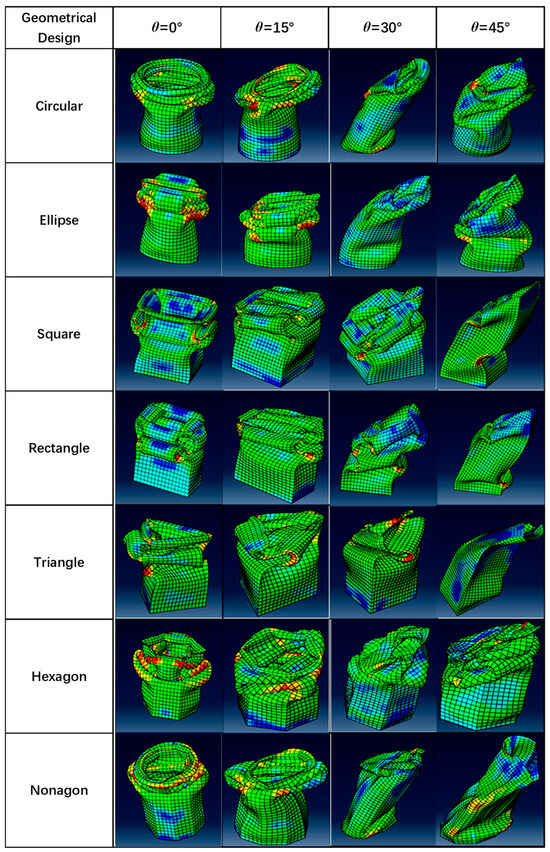Through the validated FE modeling method, the FE model of seven kinds of profiles of thin-walled tubular structures of aluminum 2024 T3 was developed, and their dynamic response was simulated and compared. The crushing responses of the seven different profiles were compared under axial (0°) and oblique impact (15°, 30°, 45°) angles. Figure 5, Figure 6, Figure 7, Figure 8, Figure 9 and Figure 10 show the deformation modes of the straight and tapered thin-walled structures under different oblique impact loading. The Mises stress distribution of straight and tapered tubes was shown in finite element analysis, where the blue color represents the lower Mises stress of 1.38 MPa, and red color denotes the higher Mises stress of 5.45 × 102 MPa. The tubes mostly absorb energy in progressive collapse modes, and their magnitude decreases further when the tubes begin to experience global bending collapse [31,32,33]. All seven types of tubes, under load angles of 0° and 15°, exhibited progressive buckling initiated at the impacted end, forming lobe folds through a progressive collapse mode. The initial observation from the visual deformation showed that the tapered tubes were more stable and only started to bend at a larger angle than that of the straight tubes [34,35]. For instance, the tapered tubes still experienced a progressive collapse mode at a 30° angle, while the straight tubes tended to bend at the same angle. A single bending mode developed in all tubes occurred at 45°, in which one side of the tubes was bent inwards, and the other side was bent outwards with respect to the load angle compression. The crushing behavior of thin-walled straight and tapered tubes under 0°, 15°, 30°, and 45° impact angles were numerically simulated. It was shown that the impact angle significantly affected the crushing response of those thin-walled straight and tapered tubes. Under the axial loading (α = 0°) or a small impact angle, e.g., α = 15°, seven designs of thin-walled tubes deformed progressively from the impacted end to the fixed end. It was observed that the so-called “accordion-type” failure mode was associated with high energy-absorbing capabilities. Under oblique impact loading at 45°, a few foldings were shown at the loading end of the thin-walled tubes. Then, a plastic hinge occurred near the fixed end of the thin-walled tubes around the plastic hinge during the subsequent crushing process. The seven thin-walled tubes exhibited global buckling deformation. Then, the crushing force increased instantly under impact loading and fluctuated around a mean value during the progressive crushing process. As the impact angle increased, the crushing force level decreased in seven designs of thin-walled tubes, which reduced energy absorption at large impact angles.