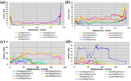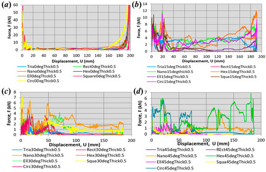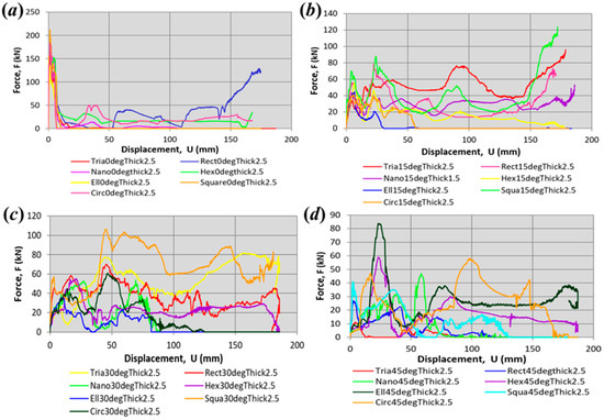 The dynamic crushing load versus displacement curves from finite element analysis represent the energy absorption for each kind of profile. The variables of oblique impact loading and wall thickness analyzed in this study are presented in Figure 11, Figure 12 and Figure 13. The plotted load–displacement curves were obtained from the processing data values of force versus time and displacement versus time in the finite element analysis using the nonlinear explicit method. The displacement in this study refers to the displacement when the rigid striker is in full contact with the tubes during crash impact. It is evident that the impact angle significantly influences the response of the thin-walled tubular structure. The PCF of the tubes occurs instantly at the beginning, corresponding to the initiation of tube buckling by the striker plate load impact. As the impact angle increased, the PCF values decreased, which reflected the reducing energy absorbed at a larger angle [36]. Then, the crush responses fluctuated around a mean value throughout the remainder of the crushing process and increased again once it had achieved its densification phase. The densification phase refers to the inability of the tubes to absorb energy.
