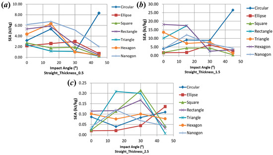 Effect of impact angle and wall thickness of specific energy absorption (SEA) on thin-walled straight tubes under three wall thicknesses: (a) 0.5 mm; (b) 1.5 mm; (c) 2.5 mm.