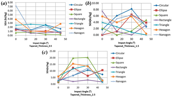 Effect of impact angle and wall thickness of specific energy absorption (SEA) on thin-walled tapered tubes under three wall thicknesses: (a) 0.5 mm; (b) 1.5 mm; (c) 2.5 mm.