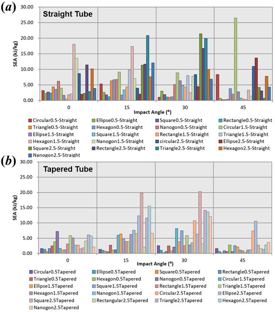 Results of SEA of thin-walled tubes as a function of impact angle and wall thickness: (a) straight type; (b) tapered type.