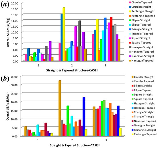 Result of overall SEAα with thin-walled straight and tapered tubes with seven geometry profiles: (a) CASE I; (b) CASE II.