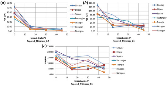 Effect of impact angle and wall thickness of PCF on thin-walled tapered tubes with three wall thicknesses: (a) 0.5 mm; (b) 1.5 mm; (c) 2.5 mm.