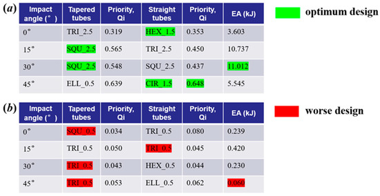 It can be concluded that the worst selection of tubular profiles is the tubes, which have a 0.5 mm wall thickness with the lowest quantitative relative rank (Ui), minimum priority/relative significance, Qi, and the least absorption energy capability. The triangular tapered tube with a 0.5 mm thickness has the worst energy absorption. The details for the optimum profiles are shown in Figure 20, where the tube choice selections are highlighted in green and red in the comparison between the tapered and straight tubes. The highest energy absorption occurs at a 30° impact angle for square tubes with a wall thickness of 2.5 mm for 11.01 kJ. It is 99.5% higher than the worst option profiles, which are triangular tubes with a 0.5 mm wall thickness at 45° impact angles.