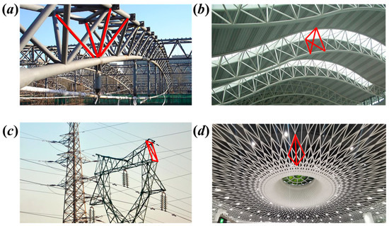 Thin-walled structures used in civil engineering applications: (a) truss bridge; (b) roof truss structural framework; (c) transmission tower; (d) “Eye of Shenzhen” of Gangxia North Hub Station.