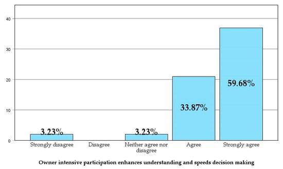 | q3 | Intensive owner participation—understood as attending work meetings as an active team member—improves understanding and accelerates decision making. | 4.14 | 4.76 | 0.62 | 15% |