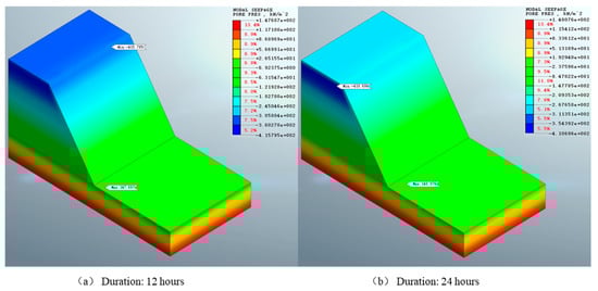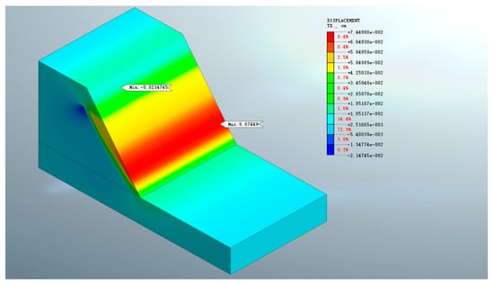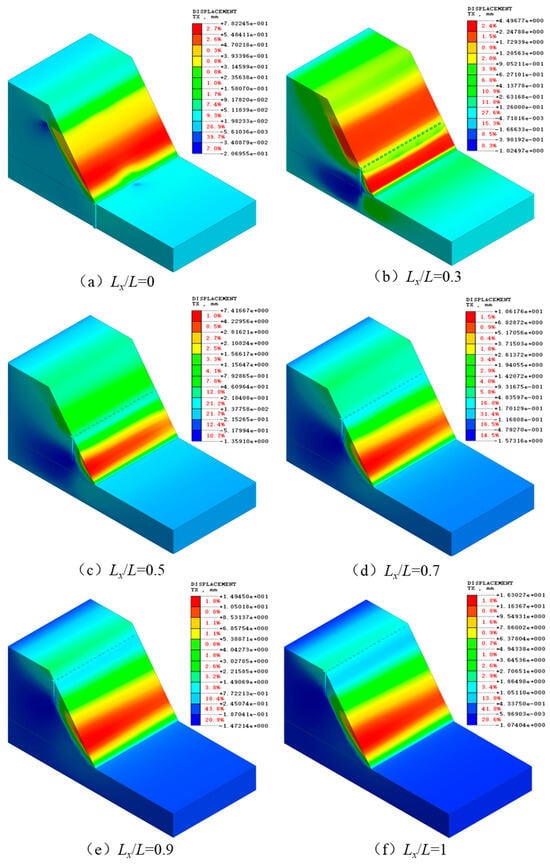 - The finite element numerical simulation results indicate that, under rainy conditions, the safety factor of slopes with specific gradients is significantly improved through the rational placement of anti-slip piles. The presence of anti-slip piles greatly enhances the stability of slopes, especially under conditions where rainfall increases pore water pressure and reduces soil strength. Notably, when the anti-slip piles are positioned in the middle of the slope, the x-direction displacement of the slope is reduced by 90.04%, decreasing from 74.49 mm (without reinforcement) to just 7.42 mm.