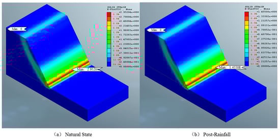 - During rainfall, the degree of saturation of the soil in front of the piles and the soil below the slope changes significantly, making it more prone to plastic strain; the matric suction of the soil behind the piles and above the slope is significantly reduced, but it still has better mechanical properties than the soil in front of the piles and below the slope.