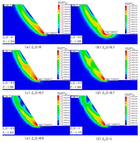 - When the anti-slip piles are arranged near the middle part of the slope, the calculated safety factor of the slope is the highest. As the position of the anti-slip piles moves towards the slope crest, the horizontal displacement of the slope soil increases, and the plastic sliding area increases, whereas, when the position of the anti-slip piles moves towards the slope toe, the horizontal displacement of the slope soil decreases, and the plastic strain area decreases. In this area, the resistance of the soil in front of the piles can better combine with the resistance of the slope soil, fully exerting the role of the anti-slip piles. Therefore, the optimal pile position should be in the middle and lower part of the slope.
