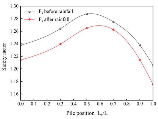 - The safety factor of the slope, both before and after rainfall, shows a similar pattern when reinforced with anti-slip piles at different positions, exhibiting a downward-opening parabolic relationship, and the trends of the two curves are the same.