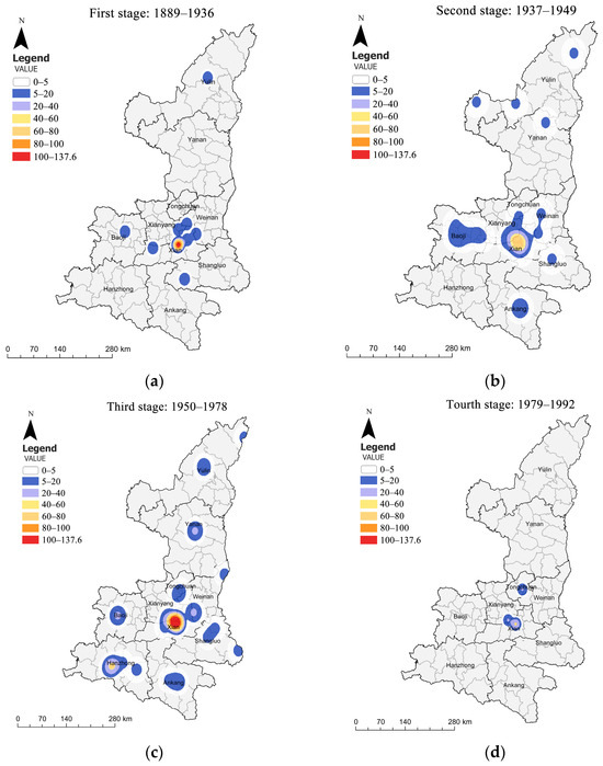 Kernel density map: (a) 1889–1936, (b) 1937–1949, (c) 1950–1978, (d) 1979–1992.