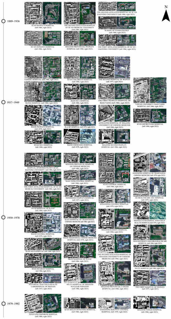 Firstly, according to the four historical stages mentioned above, the typical samples, which are still on site, were further extracted from the samples of 101 hospital heritages. The foundation of hospital heritage in Shaanxi Province was generally concentrated in the second and third historical phases (1937–1949 and 1950–1978), in line with the temporal characteristics of the development of medical history in Shaanxi Province. Based on the above, in comparison with the 1970–1990 historical images and 2023 satellite images, the changes of layout of the scale and degree of approximation of the environmental state of the hospital heritage can be observed intuitively in Figure 7. The spatiotemporal comparison of images shows common characteristics, grouped into three kinds of tendency: preserving the basis of the historical scale and renovating partially, changing the historical scale but partially retaining the building, and large-scale demolition and (re)construction without historical scale.