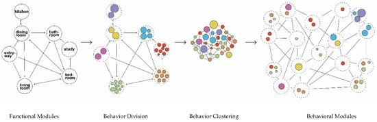 - Shifting design paradigms. This study redefines architectural space design by transitioning from “functional rooms” to basic modular designs driven by behavioral correlation. Specifically, it identifies 35 micro-level residential behaviors, which are consolidated into 14 universal behavioral space modules.
