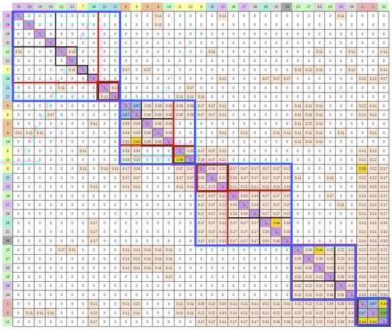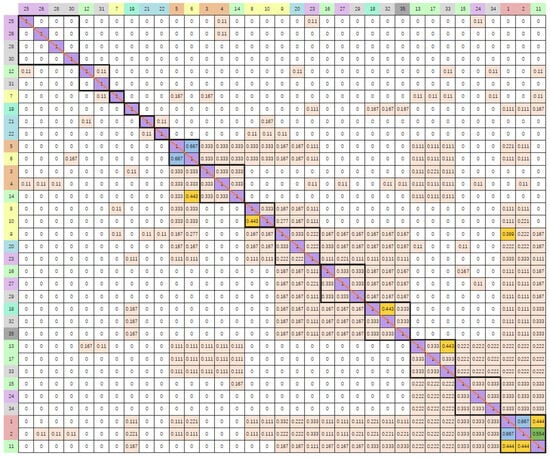 | R8 | 8 | {7,12,19,25,26,28,30,31},{8,10},{1,2,11},{13,15,17,24,33,34},{16,18,27,29,32,35},{9,20,23},{3,4,5,14},{21,22} | 0.357 |