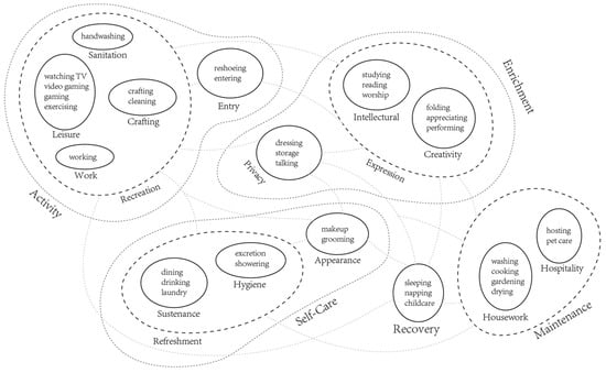 - m2 (self-care): {5: excretion, 6: showering, 3: dining, 4: drinking, 14: laundry, 8: makeup, 10: grooming}. The integration of self-care and sustenance emphasizes the centrality of these functions in daily life.