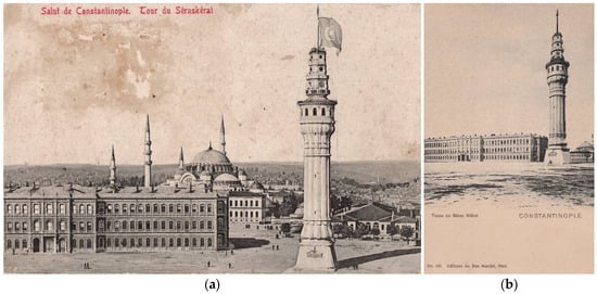 The Beyazıt Tower (41°0′46.0548″, 28°57′53.406″), built several times since the early 1700s with different forms and materials, was burnt or demolished many times over the years. The inscription on the tower’s base indicates that it was built in 1826, together with the Seraskerat Building (now Istanbul University Rectorate Building). It is known that it was built as masonry by architect Seyyid Abdülhalim Efendi. A lead-covered wooden cone existed on the Guard Floor in the first built structure. In 1849, three floors with an octagonal plan were added to the cone, and a steel flagpole was placed onto the tower. Until the 1950s, the tower was used as a fire watchtower to ensure communication between the districts of İstanbul in case of fire. Today, it is used to report the weather with the lighting placed on the top floors [1]. Figure 1 shows anonymous postcard images of the tower from the end of the 19th century.