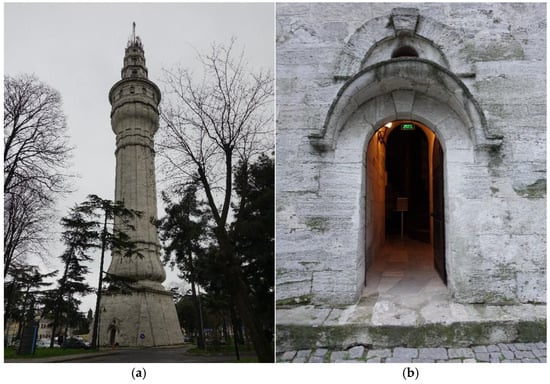 (a) General view of Beyazıt Tower (41°0′46.0548″, 28°57′53.406″); (b) arched entrance door (February 2018).