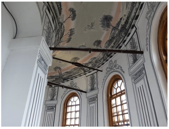 The wall thickness between the elevations of 12.9 m and 38.4 m is approximately 1.80 m. Above 38.40 m, the tower expands with a double curvature form. At 43.30 m, the wall thickness increases to 4.60 m. Inside the tower, after 179 steps, the first floor is reached with an arched entrance featuring a circular plan at the elevation of +45.40 m, known as the Guard Floor. This floor has panoramic views with 12 windows. There are square and cylindrical tension rods positioned on and between these windows. The walls are finished with plaster, and the vaulted ceiling is adorned with landscape paintings (Figure 3). There are eaves on the Guard Floor, and the above floors’ eaves are surrounded by railings.