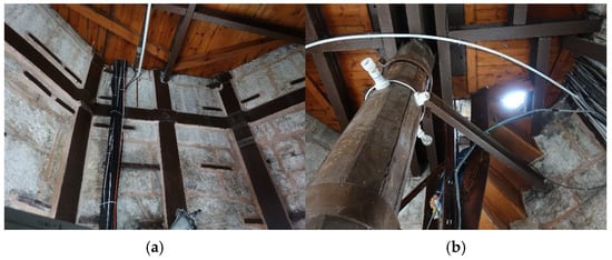 Three octagonal planned floors were built by removing the cylinder cone on the Guard Floor in 1849. The three levels are named as follows: the first level is called the Sign Level, the second is the Basket Floor, and the third is the Starboard Floor. Each of these floors features wooden flooring supported by steel IPN profiles in both directions. One end of the I-profiles is connected to the walls, and the other end to the other I-profiles or the middle wooden spar. All three floors are gradually reduced in the plan. Each floor has circular metal windows on four sidewalls. The balconies on the floors have stone balustrades. While rubble stone was used throughout the tower, limestone was used to construct these floors with steel clamps between them in a steel carcass. Figure 4a,b shows these steel clamps and carcasses. Above the last floor of the tower, there is a steel flagpole with a height of approximately 12 m. The bottom diameter is about 38 cm, and the tapered top diameter is about 20 cm, with a thickness considered to be 5 mm.