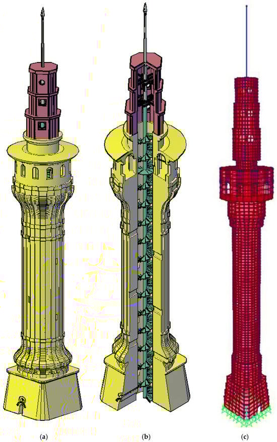 Many historical masonry tall buildings were built on the Earth centuries ago and survived or suffered minor or severe damage during a natural disaster. In addition to the historical importance of these masonry structures, due to the characteristics of the period in which they were built and material differences, examining their structural behavior is also very important and exciting in engineering. These towers were built using stone, brick, or a combination of both and with different mortar materials. Towers with different geometry, wall thickness, and heights have been the subject of many studies. These studies in the literature include subjects such as numerical models and simulated studies [2,3,4,5,6,7,8,9,10], studies on the effects of environmental conditions on dynamic characteristics [11,12,13,14,15,16], comparison of experimental and numerical studies, and updating the analysis models [17,18,19,20,21,22,23,24,25,26,27,28,29,30,31].