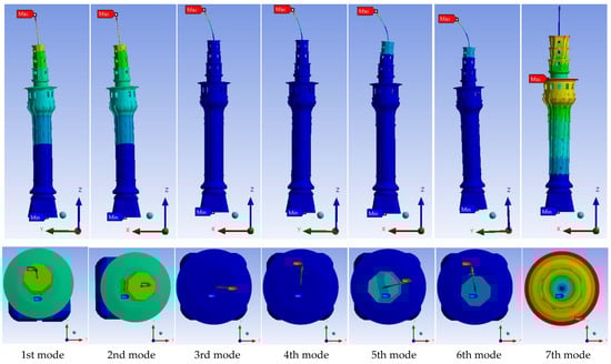 Table 6 gives the update sequence for the solid model and the values of the modulus of elasticity in each update step. After the first iteration, the fifth and sixth modes could not be approached by proportional updating using a single modulus of elasticity for the masonry body. Therefore, a separate modulus of elasticity was defined for the additional tower stories where the highest modal deformations occur. In Table 6, Em1 represents the modulus of elasticity of the original structure, Em2 represents the additional floors, and Efp represents the flagpole. Similar operations were performed for the shell element model, and the results are given in Table 7. For both models, the modulus of elasticity obtained after the update process was considered to be around 10,000 MPa for the original structure and 700 MPa for the additional stories.