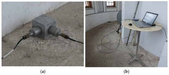 Since the piezoelectric accelerometers are uniaxial, the sensors were positioned perpendicularly to measure vibrations in two directions. No holes were drilled in the walls or floors for installation, considering the tower’s historical nature. For this reason, a rigid connection element was used for the orthogonal placement of the sensors, and this connection element was bonded to the floor with 3M brand transparent double-sided mounting tape. Figure 8a shows the 10 × 10 cm concrete connecting element, and Figure 8b shows a photograph taken during experiments in place.