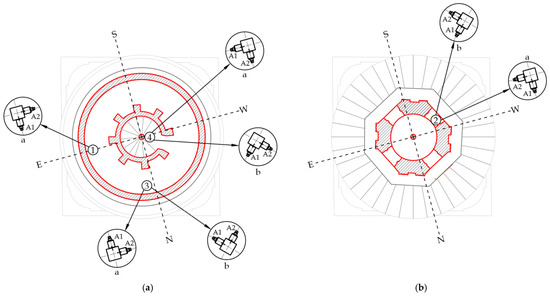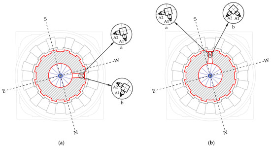 The fifth and sixth tests were carried out in the staircase, on window openings, at elevations of +30.04 and +27.17. The sensor directions at these points are given in Figure 10a and Figure 10b, respectively.
