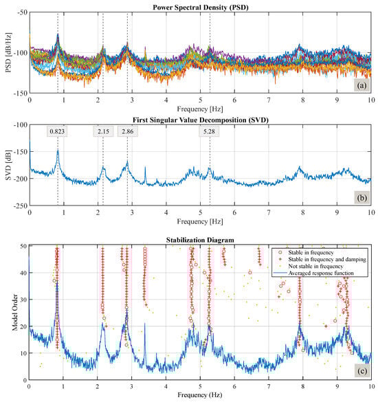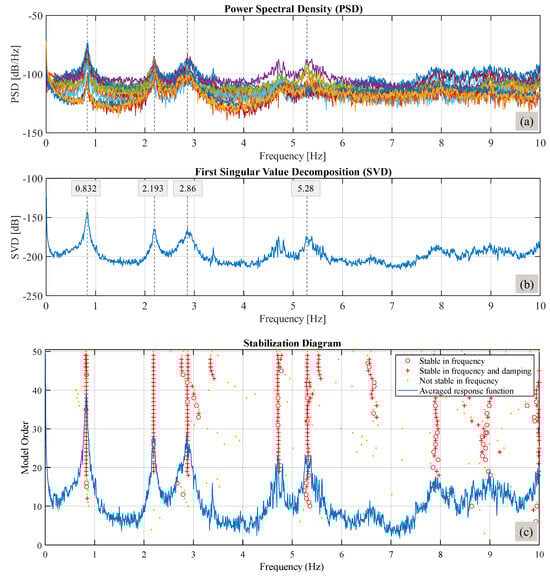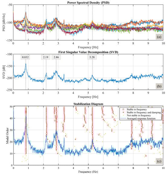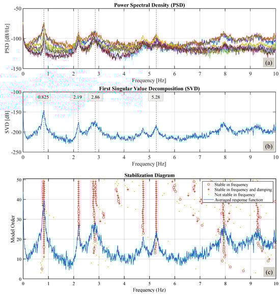Results for A1 sensor and orientation a: (a) PSD results; (b) First Singular Value Decomposition results; (c) stabilization diagram of SVD.