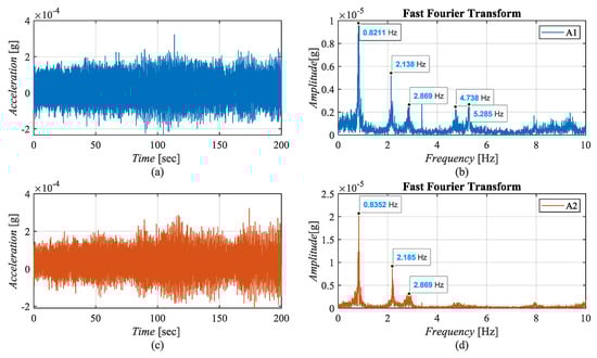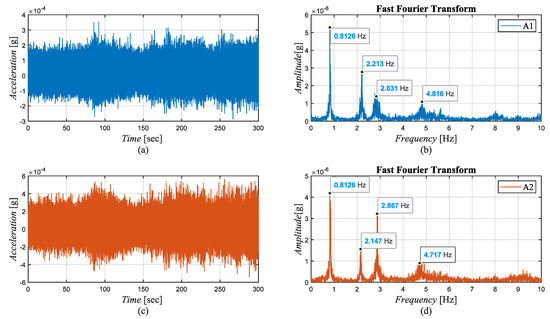 Vibration recording started on 11 February 2018. Tests were carried out on the Guard (+45.40) and Sign floors (+55.50) at points 1 and 2. Among the sensors located close to the eastern façade of the building, A1 was placed parallel to the north–south direction, and A2 was placed radially in the east–west direction for orientation a. The measurements on the Sign Floor were made by positioning the sensors in the window opening. The position and direction of the sensors are drawn on the plans obtained from the restoration project prepared by Haznedar et al. [37] and are given in Figure 9 and Figure 10. The sampling frequency was taken as 1650 Hz, the default setting of NI 9234, in all records.