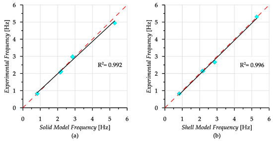The updated modulus of elasticity is compared with the experimental results as a percentage, as well as a graphical comparison suggested by Rainieri and Fabbrocino [54]. Figure 18 shows the relationship between the experimental and updated numerical analysis results for each analysis model. The results of the modal frequencies obtained for the shell and solid models are homogenous and distributed evenly around the 45° reference line. The coefficient of determination, the R2 values, indicate that there is a good fit of the updated solid and shell model frequencies with the actual behavior of the tower. These results showed that the determined global modulus of elasticity is reliable for investigating the actual behavior of the tower.