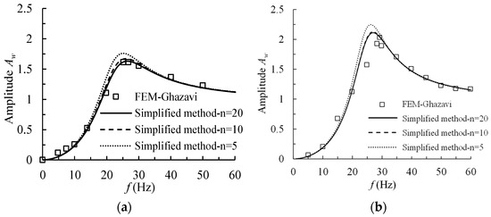 The lateral dynamic impedance Γh was normalized by dividing by 2Esreq, and compared with those from the FEM as shown in Figure 7. The results show that satisfactory calculation accuracy is achieved when n is close to 20, verifying the efficiency and rationality of the proposed simplified approach. However, the results also show that increasing the number n to improve the accuracy of lateral dynamic impedance is not obvious.