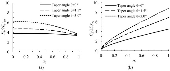 Soil properties and geometric parameters of tapered piles are as follows: elastic modulus ratio Ep/Es = 1000, density ratio ρp/ρs = 1.5, length–diameter ratio L/req = 30, pile elastic modulus Ep = 20 GPa, and pile length L = 15 m. In order to study the effect of taper angle on dynamic stiffness and dynamic damping, the dynamic characteristics of three kinds of tapered piles with taper angles θ equal to 0°, 1.5°, and 3° were first calculated and analyzed for comparison [7]. To ensure that the tapered piles have the same volume at different taper angles, the radius of the pile head and pile end were calculated using Equation (28).