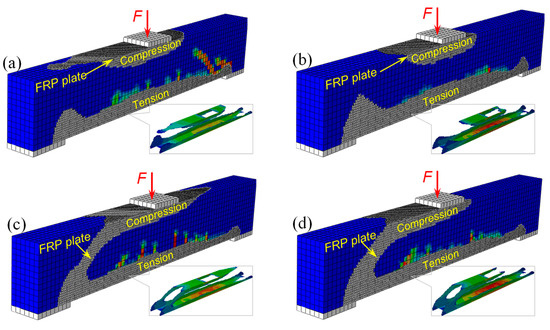 Figure 4d shows the final configuration of FRP for strengthening the damaged RC beam. The FRP layouts for the undamaged and damaged beam are similar (see Figure 4c,d). The FRP, primarily distributed in the bottom tension region and the compression zone around the loading point, compensates for the loss of tensile strength in the fractured steel bars. Concrete damage is usually small in regions reinforced with FRP, while cracks still appear in unreinforced areas, especially along the edges of FRP. The maximum displacement of the repaired beam without any constraint is 0.36 mm.