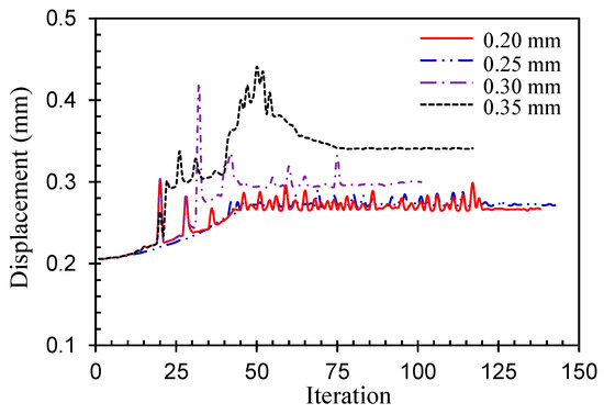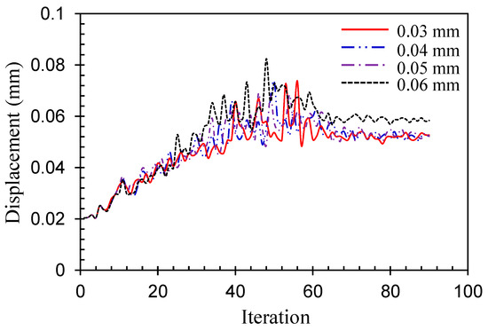 The evolutionary histories of the maximum displacement in the damaged region of RC beam under different displacement constraints are shown in Figure 6. The final displacements converge to approximately 0.34 mm and 0.29 mm when the displacement constraints are set to 0.35 mm and 0.3 mm, respectively. The final displacements of the repaired RC beam are close to the constraint values. However, when the constraints applied are 0.25 mm and 0.2 mm, respectively, the final displacement value (i.e., 0.27 mm and 0.26 mm) is greater than their constraint values. This may be because the constraint value exceeds the limit of the minimum displacement of the repaired beam.