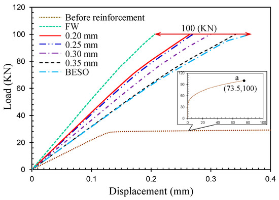 Figure 12 presents a comparison of the load–displacement curves for various displacement constraints. The maximum displacement of the damaged slab is 0.21 mm before reinforcement. In the “FW” case, the structural stiffness is maximized, and the final displacement is minimized (i.e., 0.079 mm). Compared to the load–displacement curve obtained from the BESO method, the structural stiffness under displacement constraint is larger and the maximum displacement is smaller.