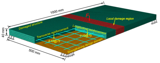 FRP, employed as a reinforcement material, is typically affixed to the surface of damaged structures to enhance load-bearing capacity and reduce structural deflection, as illustrated in Figure 1. A strengthened structure can be regarded as a composite entity, comprising FRP material and damaged concrete structure. The region where FRP is affixed to the external surface is defined as the design domain for strengthening. The bond-slip behavior between FRP and concrete is crucial for transferring the FRP’s strength to the structure, significantly impacting the nonlinear mechanical properties of reinforced structures [30,31]. However, incorporating this nonlinear behavior into the topology optimization process for FRP configurations presents several challenges. The sensitivity analysis, essential for topology optimization, becomes much more complex when the nonlinear bond-slip effect is considered. Additionally, the computational costs of integrating the bond-slip behavior in a nonlinear manner are substantial. How to effectively incorporate the nonlinear bond-slip between FRP and concrete into the topology optimization algorithm requires further investigation. It is assumed that the FRP is completely bonded to the structural surface without any slip. The mesh tie constraint in ABAQUS 2020 is employed to connect the contact surfaces between FRP material and damaged structures.