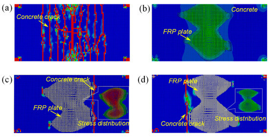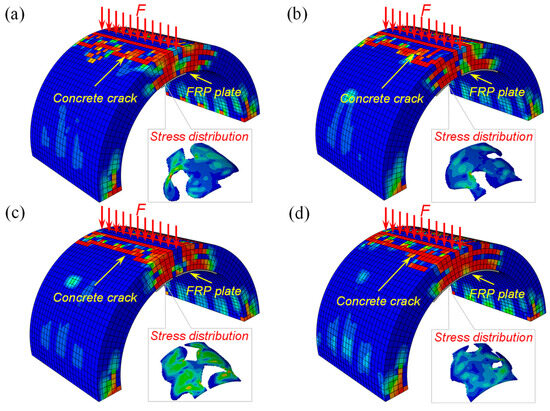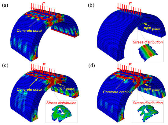 Figure 14c,d present the FRP configurations for strengthening the undamaged and damaged RC arches, respectively. While the FRP layouts for both arches are similar, they differ from the configuration for the elastic arch due to the plastic behavior of the concrete. After reinforcement, the concrete damage at the arch foot is significantly reduced. However, cracks continue to form in the FRP-reinforced area due to excessive external loading. The maximum displacement of the repaired beam without any constraints is 0.067 mm.