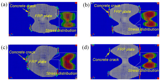 Figure 10 illustrates the FRP configurations generated by the proposed method under varying displacement constraints. The FRP topological configurations in Figure 10a,b,d are almost consistent with that of the damaged slab. The longitudinal length and width of FRP topology are different due to the different displacement constraints. In Figure 10c, the configuration of FRP is similar to the “V” shape when displacement constraint = 0.15 mm. The stress distribution of FRP is uniform, and the stress of FRP on both sides of the loading point is larger. The longitudinal distribution of FRP under displacement constraints can effectively enhance the bearing capacity of the structure and restrain the cracking of concrete.