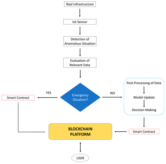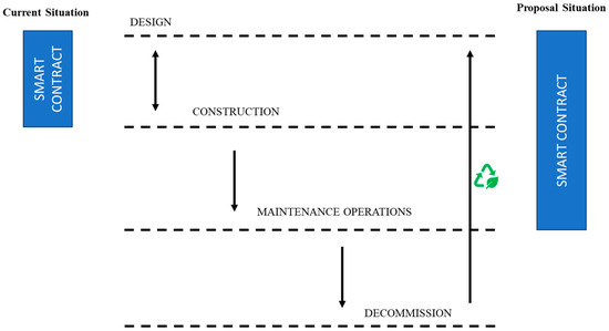 As shown in the diagram in Figure 4, the smart contract, which is based on blockchain technology, can be utilized in two different ways, making it a flexible tool throughout the life cycle and suitable for both routine maintenance activities, whether ordinary or extraordinary, and in emergency situations.