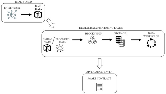 Figure 2 outlines the smart contract implementation: IoT sensors collect real-world data, which are processed (e.g., via a digital twin) and immutably stored on the blockchain. The data are then shared with stakeholders through a structured data warehouse, enhancing decision making [25].