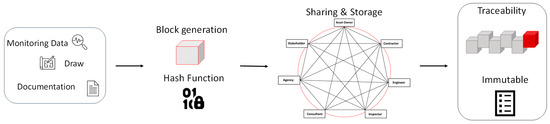 Smart contracts are primarily implemented on private blockchains [31]. Each transaction generates a block containing monitoring data and documentation (Figure 3). This block is verified, linked to the chain, and secured by the blockchain’s structure. Any attempt to alter a block would require modifying the entire chain, ensuring data integrity and security over time [32].