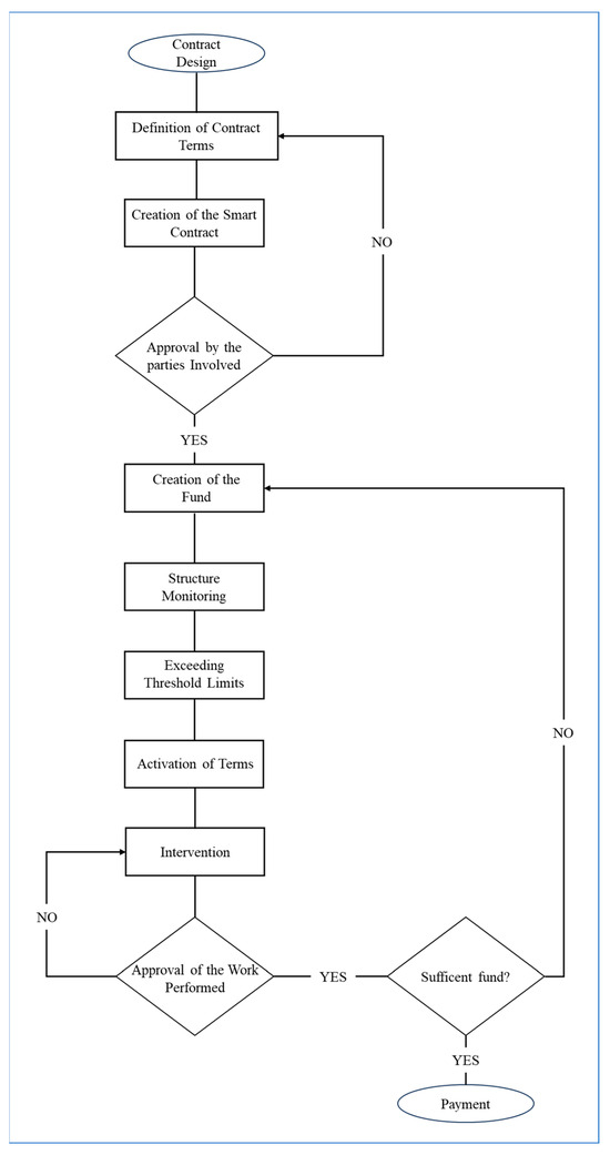 Once written, the code, within a file with the .sol extension, is compiled to generate bytecode, which is then distributed on the blockchain, making the contract operational. The monitoring system, composed of IoT sensors [52], and supported by low latency 5G technology [53], enables near real-time monitoring, acquiring values that are compared with the thresholds established during the design phase of the structure. This monitoring system thus acts as an external oracle, a source of data external to the contract but on which some of the smart contract’s actions depend [54,55]. The internal code of the smart contract can be developed [56]. As described, the input data consist of the values detected by the monitoring system. If these values exceed the set thresholds, the smart contract automatically activates its functions.