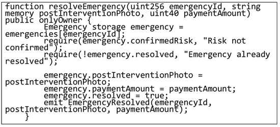 Once the intervention operations are completed, the team, using the “resolveEmergency” function (Figure 7) can declare the completion of the work and upload post-intervention images. These images, like the pre-intervention ones, are not managed within the contract but are stored on InterPlanetary File System (IPFS), which will provide a unique hash. IPFS assures that the data included in the network are unique and are protected against modifications, making these data immutable. This operation is therefore not managed by the smart contract itself but by the DApp on which it runs.