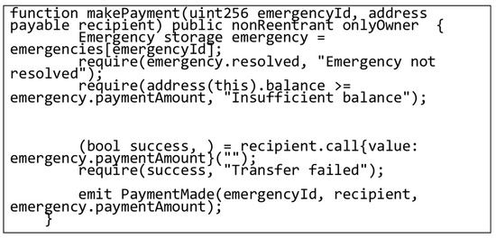 The DApp is simply an application that provides a user-friendly graphical interface for the end user. The payment for completed works is executed through the “makePayment” function. This function, of which an example code is shown in Figure 8, ensures that the specified payment fund contains the requested amount and then processes the payment instantly and automatically upon contract completion.