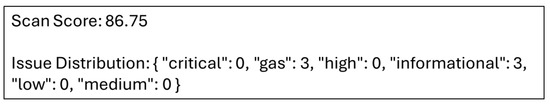 For these reasons, the functionality of the smart contract was verified using the written code efficiency verification tool SolidityScan [60]. This tool allows the functionality and efficiency of the code to be highlighted with a score from 0 to 100 points. The created code obtained a score of 86.75, with no critical issues.