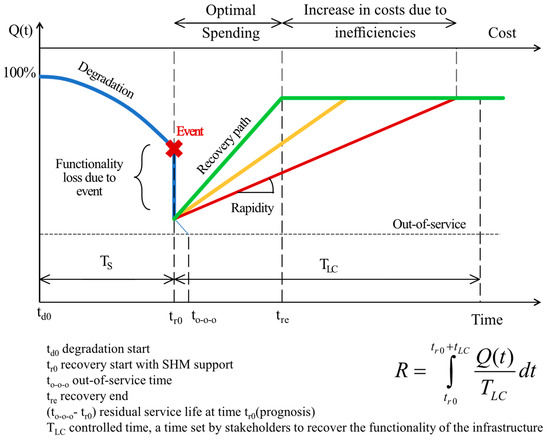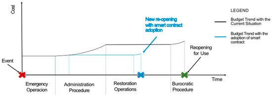 It is worth noticing how the resilience R of an infrastructure is defined by the area under the recovery line and the subsequent horizontal line [66] within the controlled time span TLC; the longer the recovery operations take, the lower the resilience. It follows that lower resilience is influenced by increased recovery time and inefficient operations. In this sense, smart contracts could help to streamline and accelerate the processes necessary for complete recovery, such as the transfer of documents needed for testing and inspections.