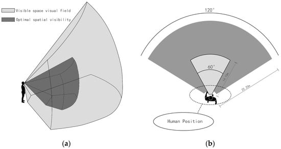 Pedestrians have a semi-curved range of visual fields, including the optimal spatial field of view and the visible spatial field of view. The optimal spatial field of view is the range in which information is most easily accessible when pedestrians are looking straight ahead, while the visible spatial field of view is the range in which pedestrians are able to observe the information under the same conditions [25], which corresponds to the optimal and visible viewing angles of 60° and 120° horizontally and 25° and 50° vertically, respectively, and the clear visibility distance of the Guidance Signage System in this range is 14.10 m and 25.20 m, respectively (Figure 1).