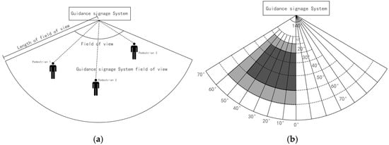 Pedestrian visibility schematic [25]: (a) the best, visible spatial view of the human Guidance Signage System; (b) schematic of the visible area of the Guidance Signage System.
