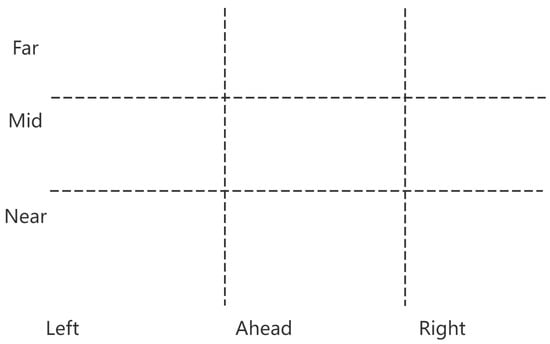 In the process of wayfinding, the Guidance Signage System in the connecting space leads to corresponding changes in the visual perception and behavioral habits of individuals due to the spatial variability of the nodes. Therefore, when exploring the visual prominence of the Guidance Signage System, it is necessary to make reasonable adjustments to the location area as well as the type of Guidance Signage System in the experimental scene according to the characteristics of the specific scene space. In the studies of visual scenes by scholars at home and abroad, the visual field plane is usually subdivided into several fixed gaze regions, each representing a specific gaze target. Geoffrey U [30], in his study of visual attention while driving, divided the gaze region into nine regions that do not overlap with each other (Figure 3).